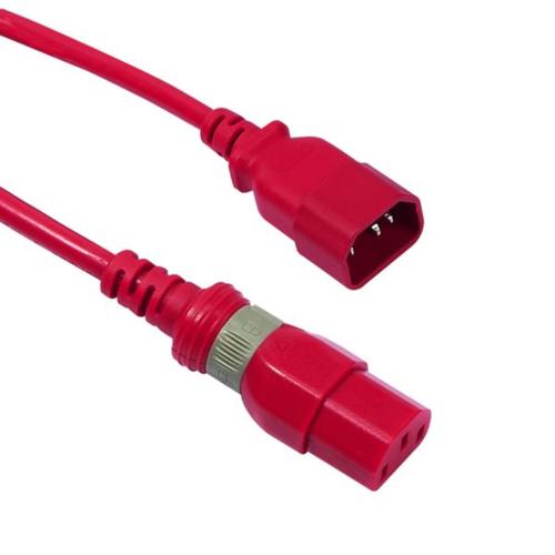 Cabos de alimentação para conexão de servidores a PDU, com mecanismo rotativo exclusivo no plugue C13 que evita desligamento acidental. Comprimento de 0,5m, cor vermelha para fácil identificação e corrente nominal de 10A.